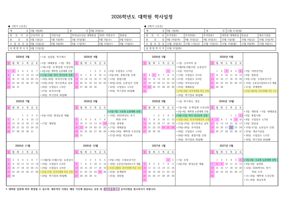 1. 2026학년도 대학원 학사일정을 붙임과 같이 확정하여 알려드립니다.