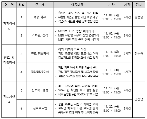 2. 주 제 : 자기이해(S), 진로 및 직업탐색(T), 진로계획(A) 역량 요소별 특강